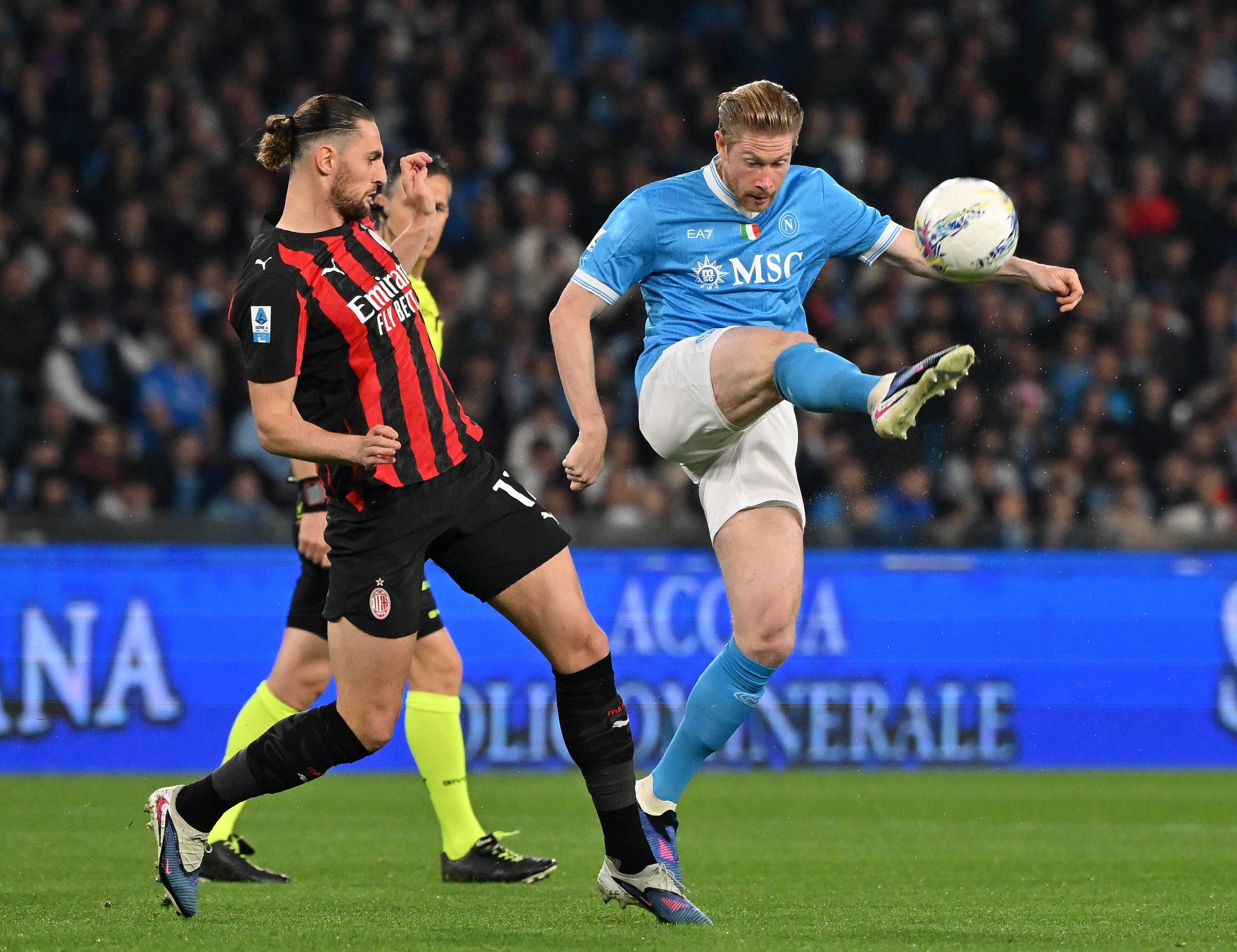 4月6日,那不勒斯队球员德布劳内(右)与AC米兰队球员拉比奥在比赛中拼抢。 新华社发(阿尔贝托·林格利亚摄)